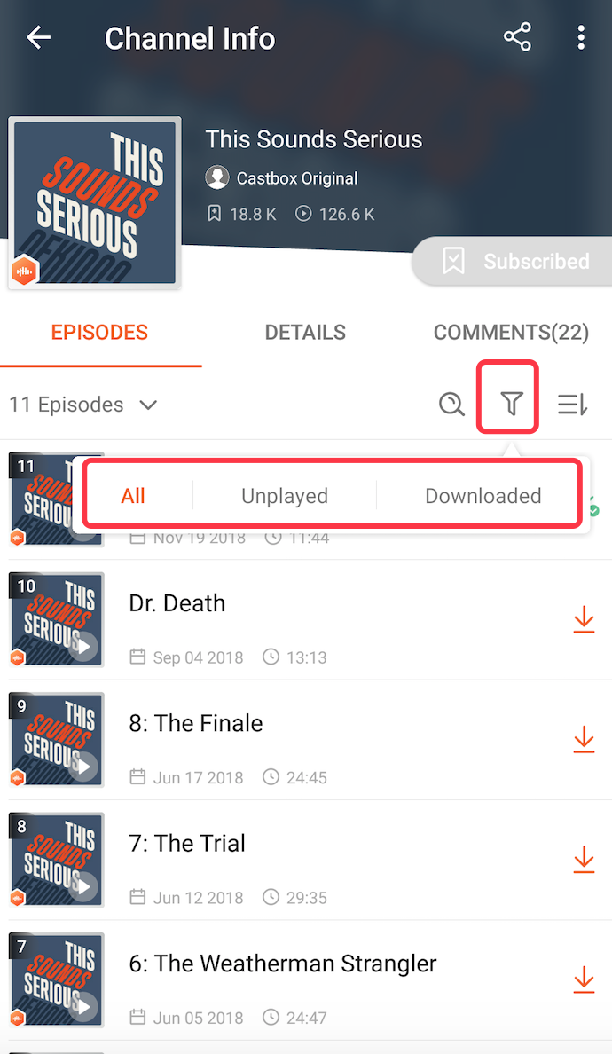 This "filter" function is also available for Downloads, Playlist and New Episodes sections so that you could feel free to filter "unplayed" or "downloaded" episodes.