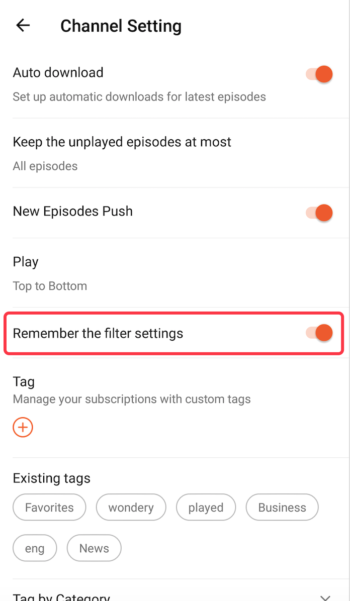 If you are an Android user, you could also set to remember the filter for a channel. Please tap the "more" button (three vertical dots) on the top right corner of Channel Info page - Settings - and enable "Remember the filter settings", as shown in picture 2.