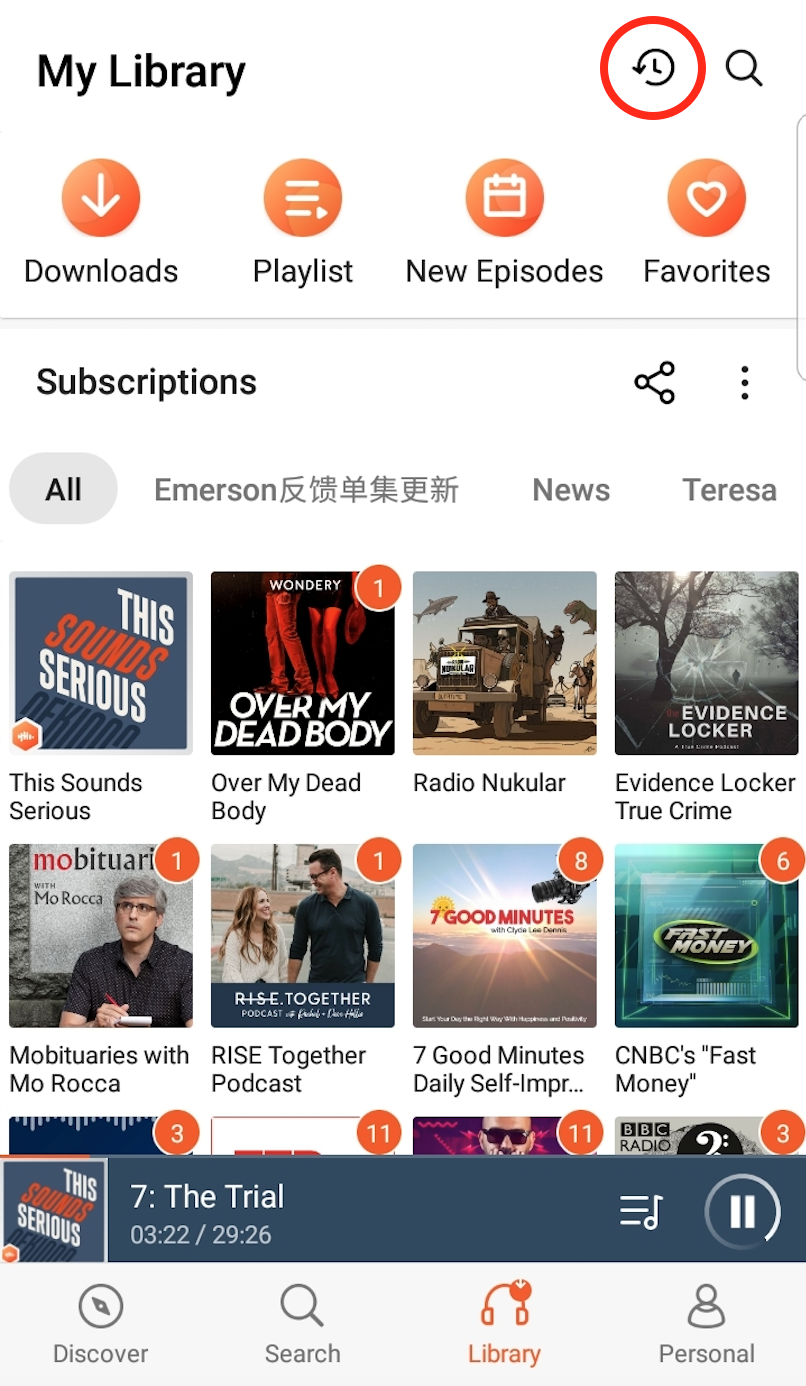 Please go to the Library tab and tap the “clock” icon on the top right corner to view your listening history.