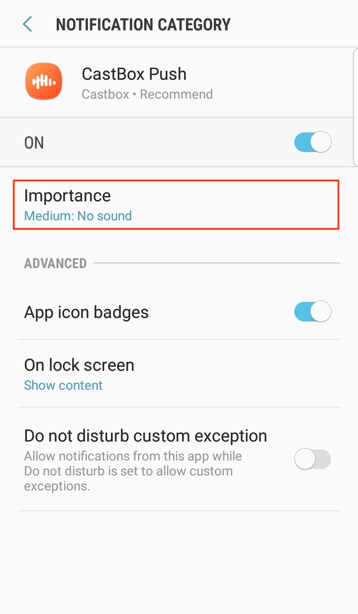 Please go to your phone settings - notification settings - Advanced Notification Settings - Castbox - tap "Castbox Push" - Importance - select "Medium" or "Low" (Eg: Samsung Galaxy S7 edge). Please check the screenshots below and see if you have similar settings on your phone.