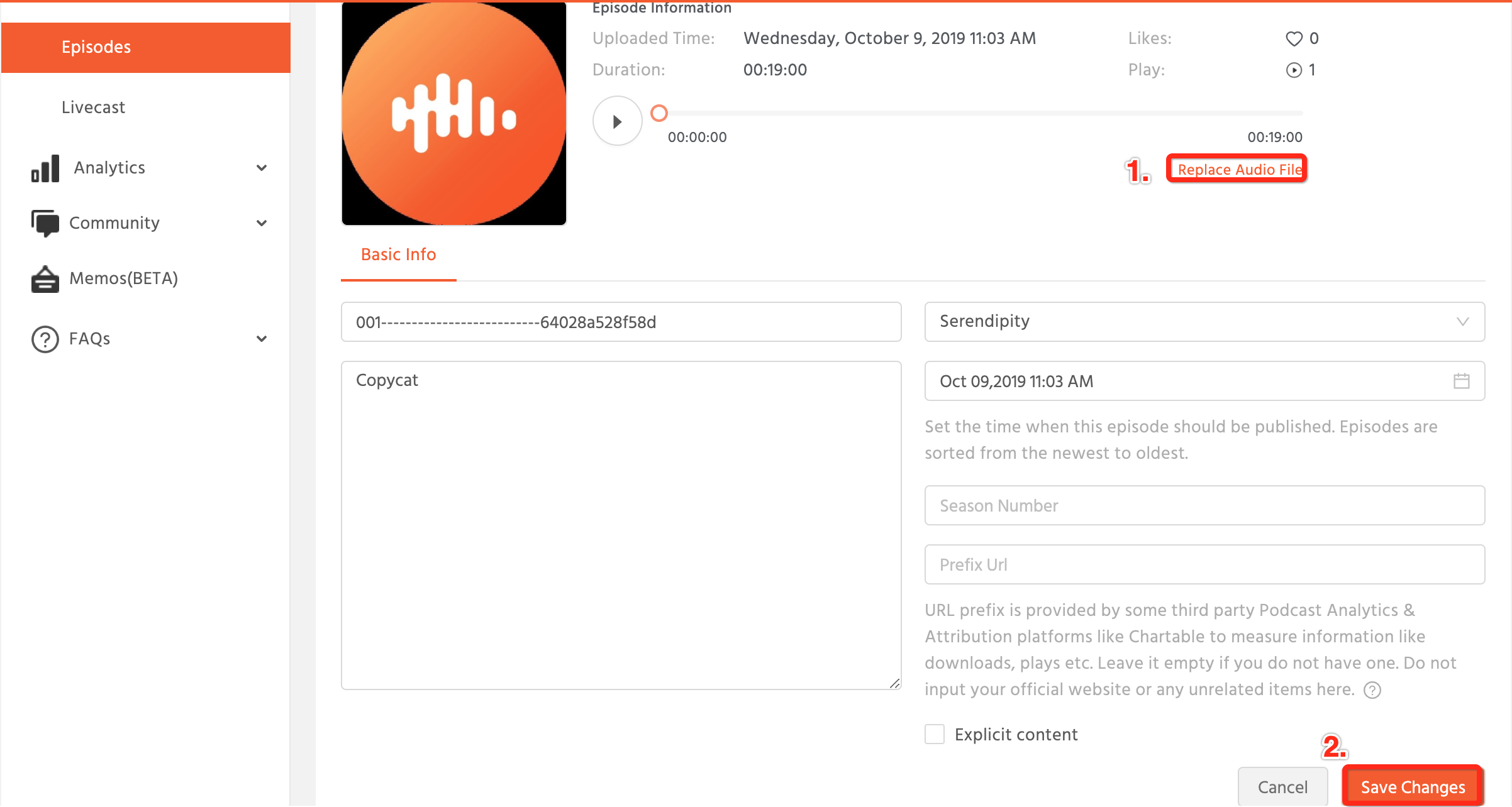 Please follow the steps as shown in the screenshot below: enter creator studio- episodes- edit- replace audio file -save changes.