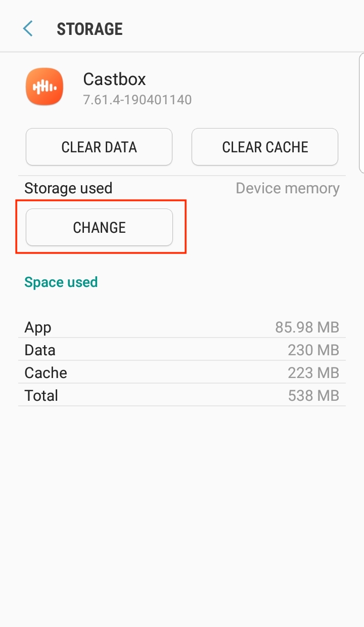 To move Castbox app to SD card, please go to the phone Settings - Apps - Castbox - Storage - Change and set it to SD card. There may be a different path according to different phone models.
