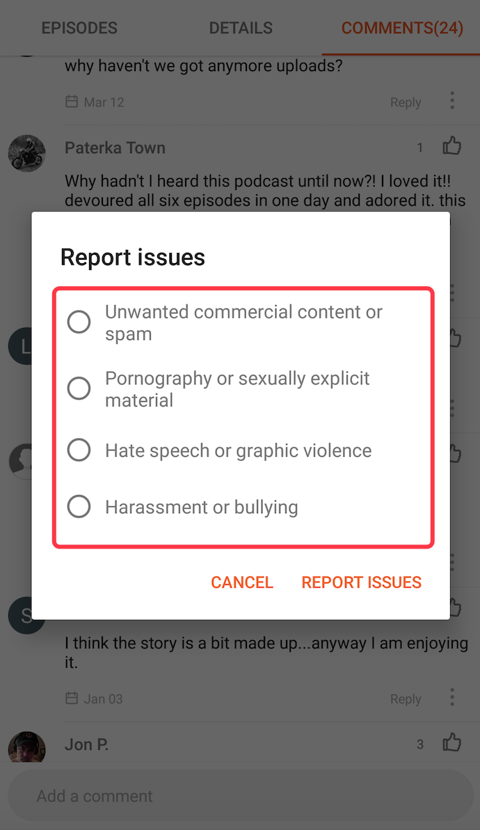 The Castbox team will review every reported comment and will try to remove offensive comments as soon as possible.