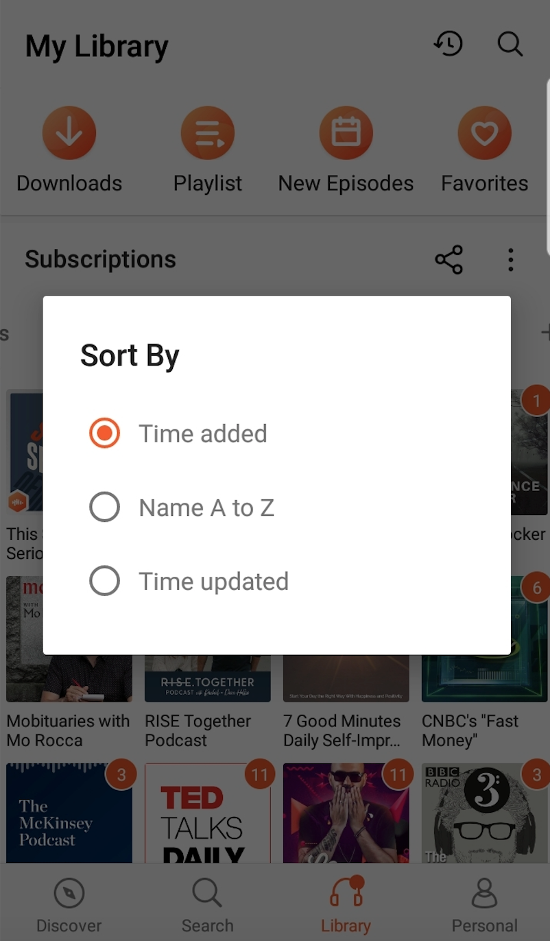 top right corner of the Subscriptions section in the Library tab. Then, tap "Sort