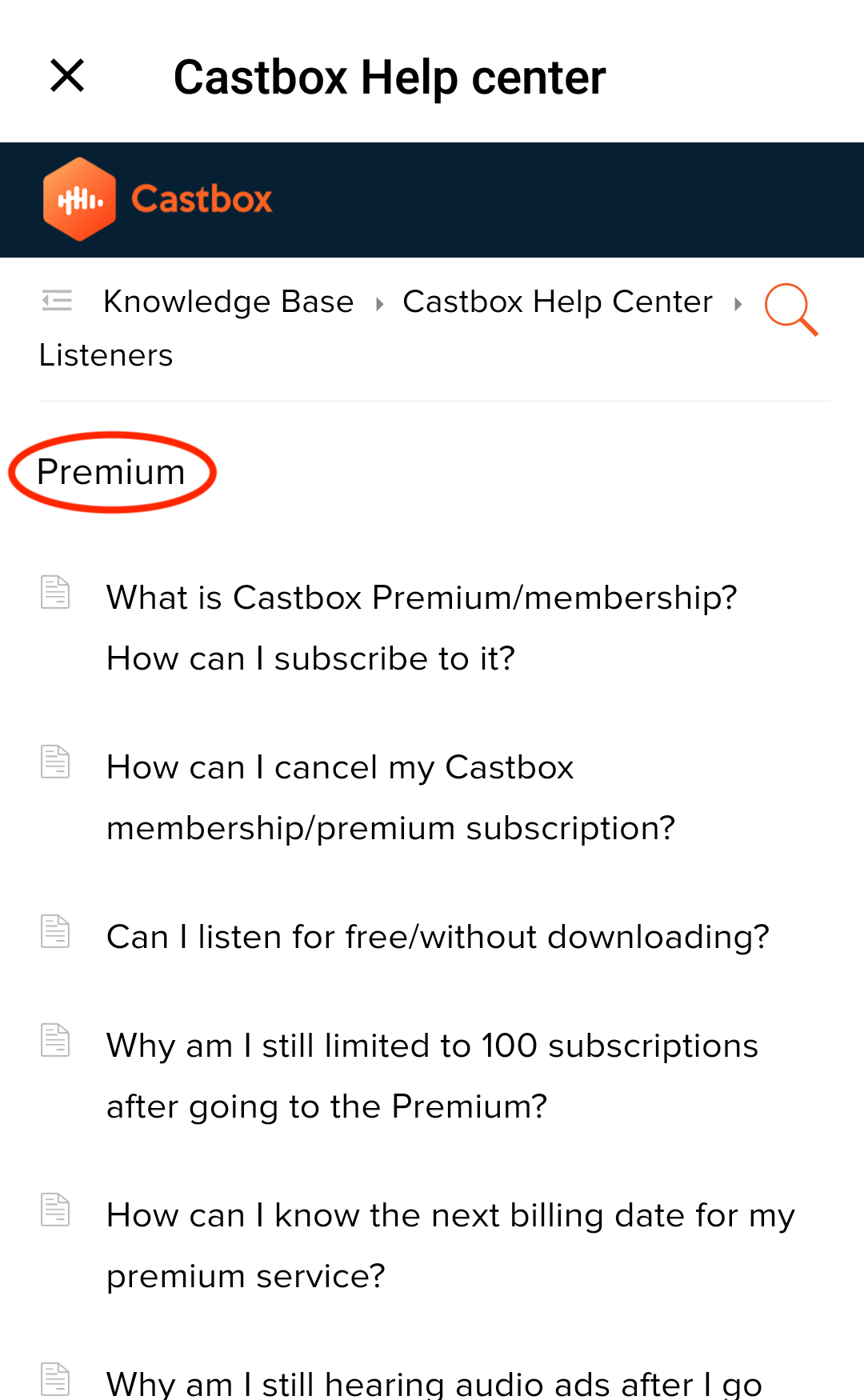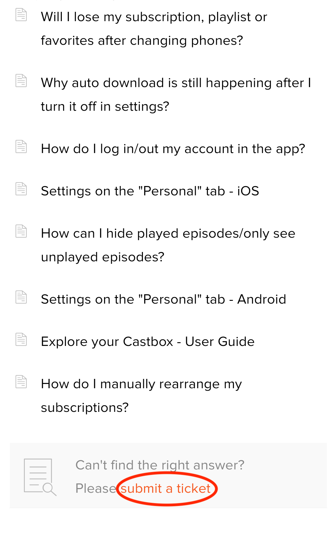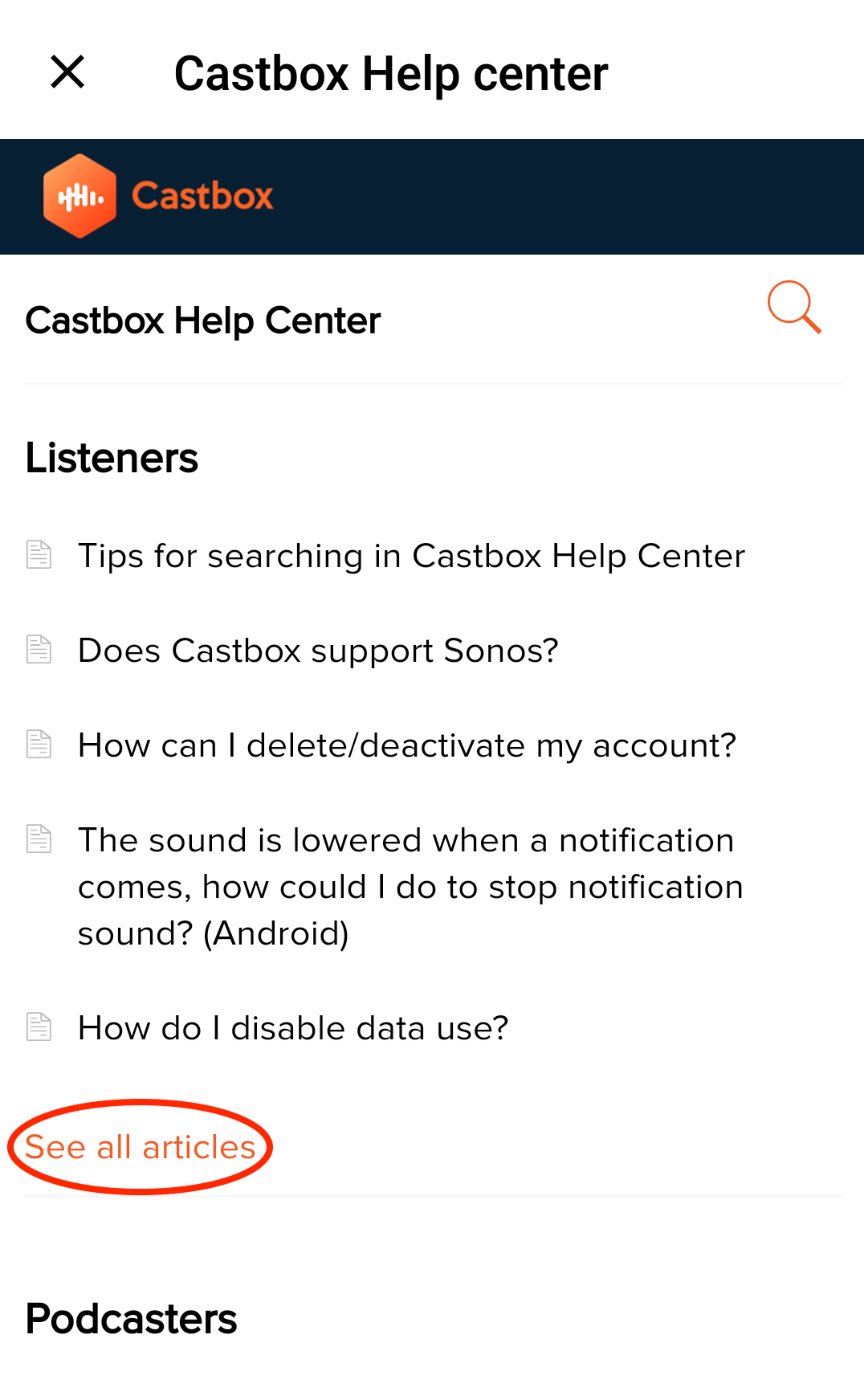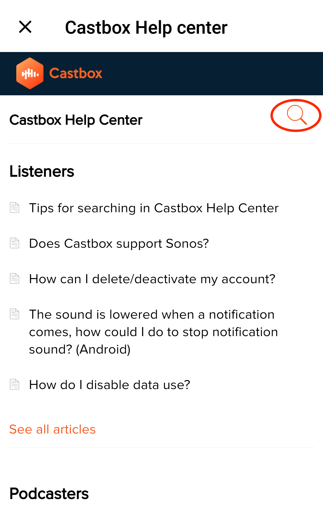 We categorized the common issues into different types, targeting at listeners and podcasters. Please tap "See all articles", scroll down and take a look at them. Please first identify which category your issue belongs to, select it and then scroll up to scan all articles of the specific category. You can check out the following screenshots.
