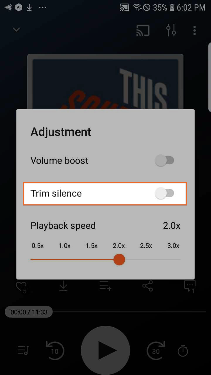 This feature will help reduce the length of episodes by cutting out pauses and other gaps at the beginning/end. The setting is available for all podcasts, no matter they are being streamed online or have already been downloaded on the device.
